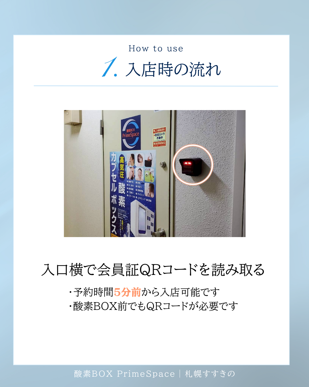 酸素BOX前のQRコードリーダーで QRコードを読み取りしてください